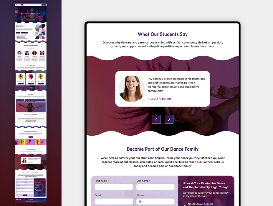 ✦ Create an energetic and elegant website for your dance academy, studio, or performing arts school. This fully customizable template helps you showcase classes, schedules, instructors, and performances — all in a lively, professional design that moves with rhythm and style.
