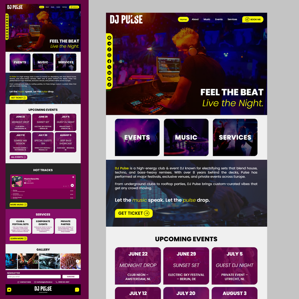 ✦ This fully customizable template is perfect for DJs, music producers, and event performers who want to promote their services, share upcoming gigs, stream music, and get booked effortlessly.