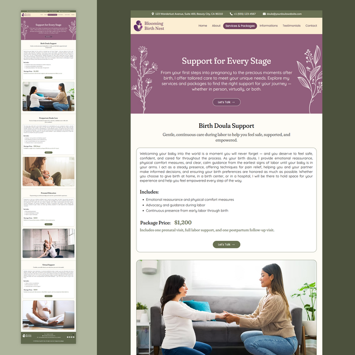 ✦ Create a warm, supportive, and empowering online presence for your doula services. This fully customizable Wix template is designed for birth and postpartum doulas, prenatal educators, and maternal care professionals who want to connect with expecting families, share resources, and encourage bookings.
