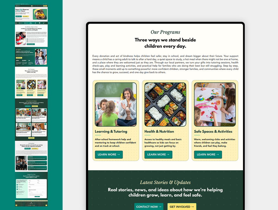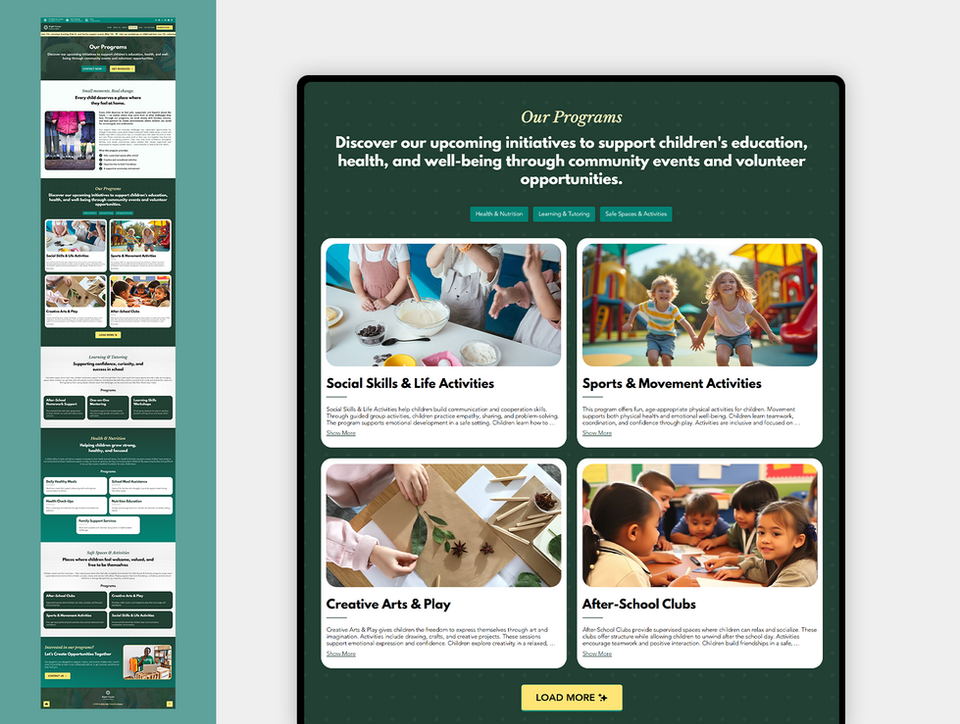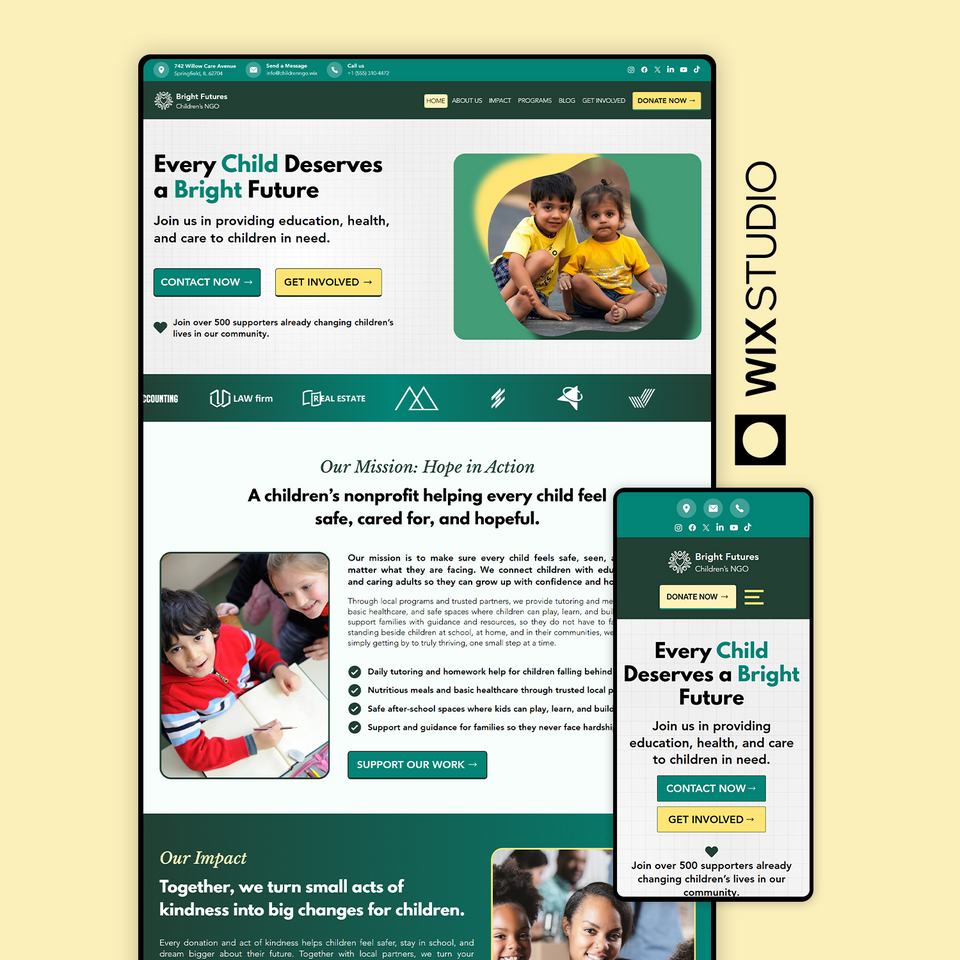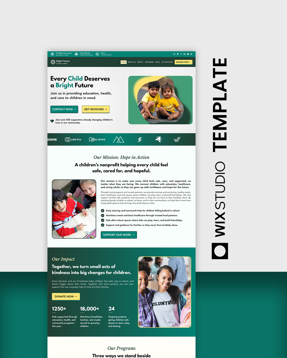✦ Build a warm, trustworthy, and mission-driven online presence for nonprofits, NGOs, and community organizations supporting children and families. This modern Wix Studio template is designed to clearly present programs, activities, and real impact while guiding visitors toward contact, involvement, or support.