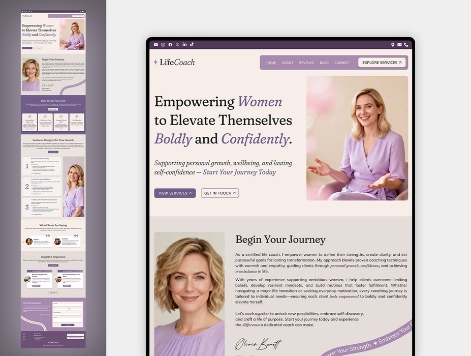 ✦ Build a confident and inviting online presence for your life coaching or therapy brand. This sophisticated Wix Studio template was created to help you engage with clients, share your message, and present your services with clarity and warmth.