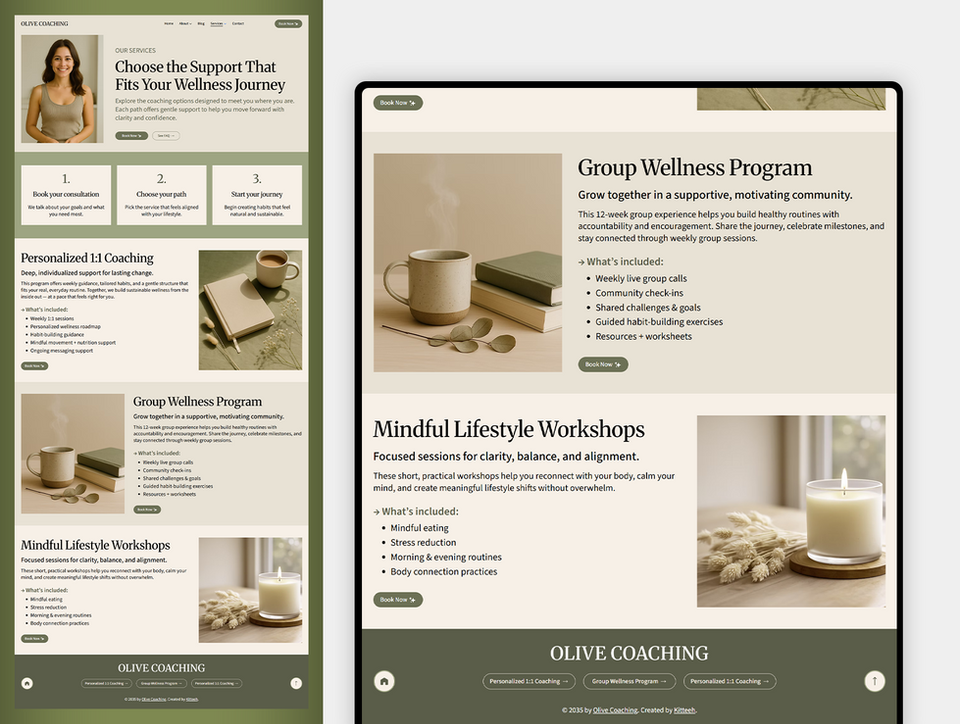 • Blog with a custom layout (wellness, mindset, lifestyle content)